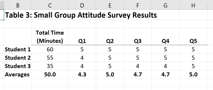 This excerpt shows a quantitative analysis of survey results measuring the attitudes of student towards a unit of instruction. This formative evaluation was used to inform improvements to the design of the instruction.